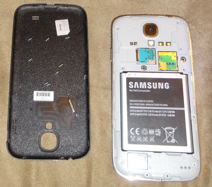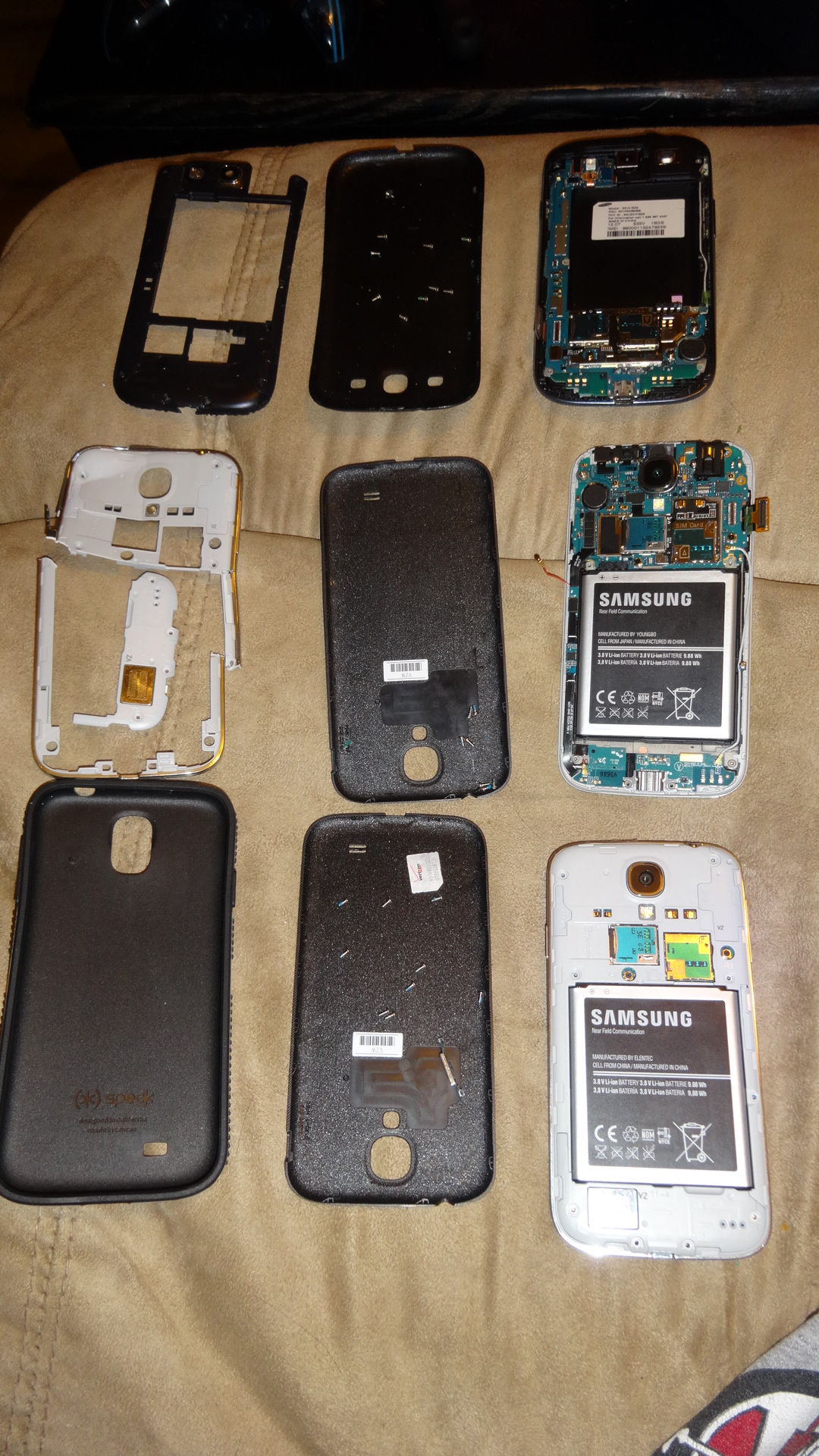 When all was taken apart, this is what I had. First image: Top row is the S3, middle is the broken S4, and bottom is the new S4. Second Image: Closeup of broken S4 and snapped back cover. Third Image: New S4 put back together.